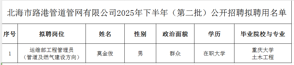 根據(jù)《北海市路港建設(shè)投資開發(fā)有限公司2025年下半年(第二批)公開招聘工作方案》相關(guān)要求,經(jīng)過報名、資格審核、面試、體檢及考察等程序,確定莫金俊為擬聘用人員(詳見附件),現(xiàn)予以公示。