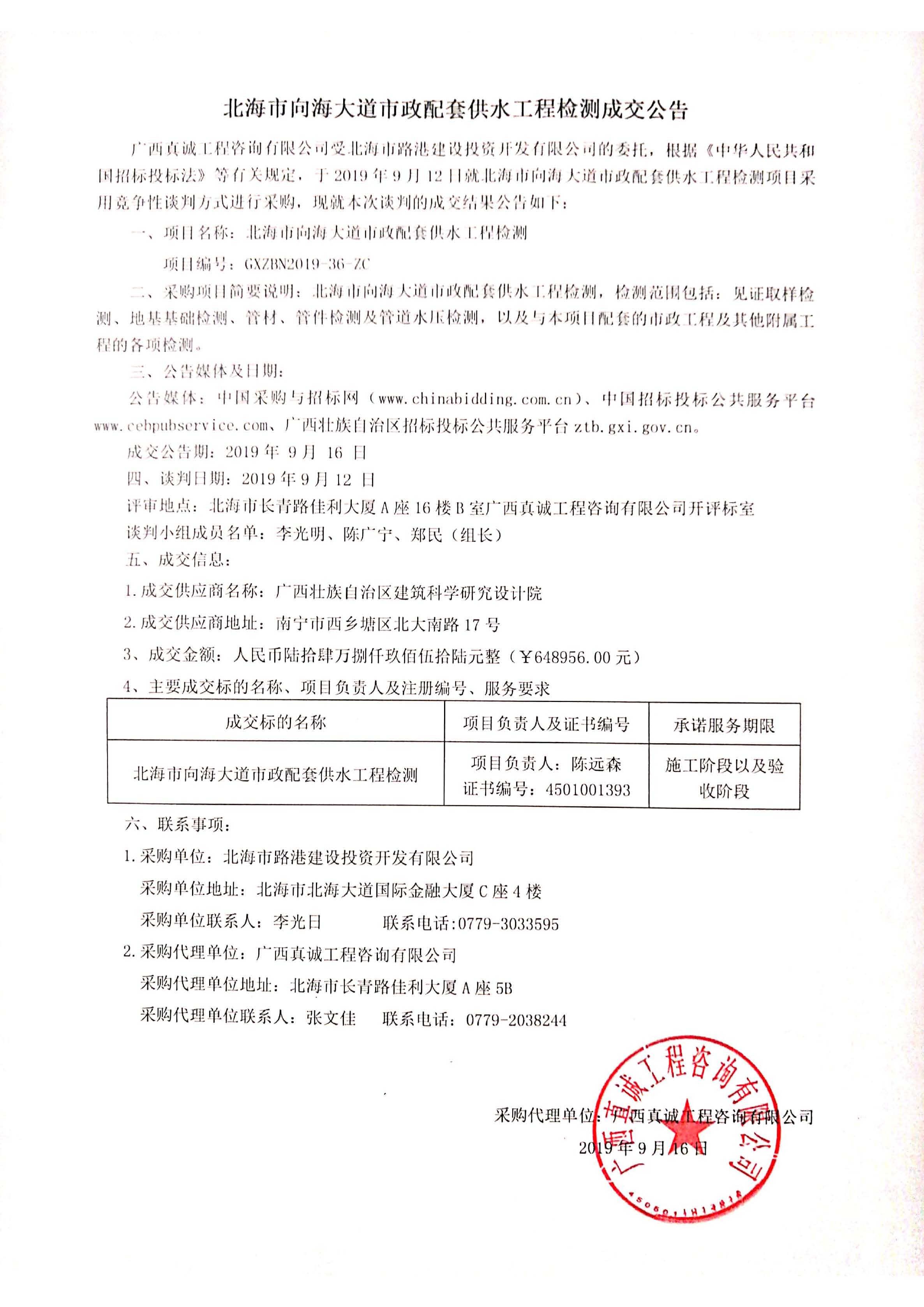 北海市向海大道市政配套供水工程檢測成交公告